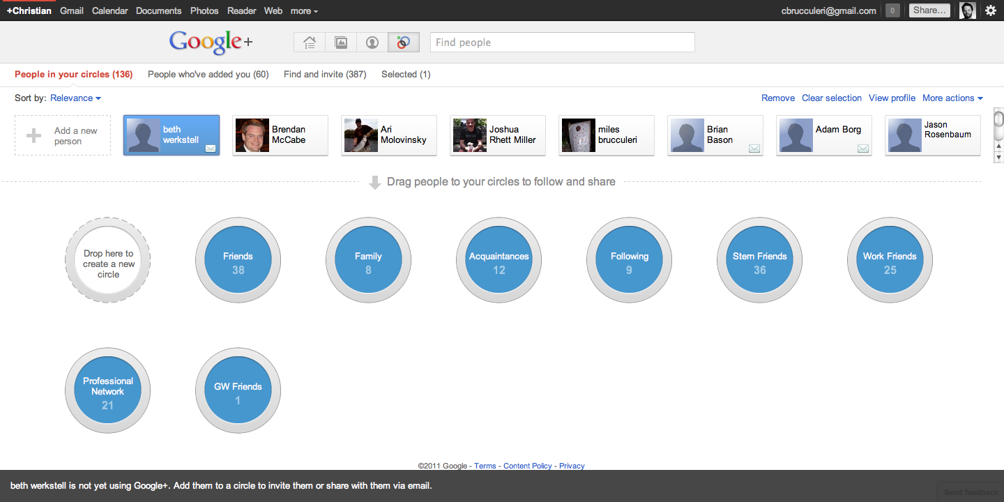 While Hangouts and Sparks are important features on Google+, I’m really interested in the stream right now (inbound and outbound content), so here’s circles: