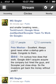 One other thought, I think that Google+’s long-term success is dependent on their success in mobile. If their iPhone application is any indicator of how they plan to tackle the channel, I am not optimistic that they will be an order of magnitude better than Facebook. Their current application misses the value that circles provides: inbound content control. Users can’t control which circles they read content from, it’s all jumbled together in the app and the only available sorting of “incoming” and “nearby” has no connection to the web product. Right now, my entire Google+ iPhone app stream is filled with journalists. That’s not useful: