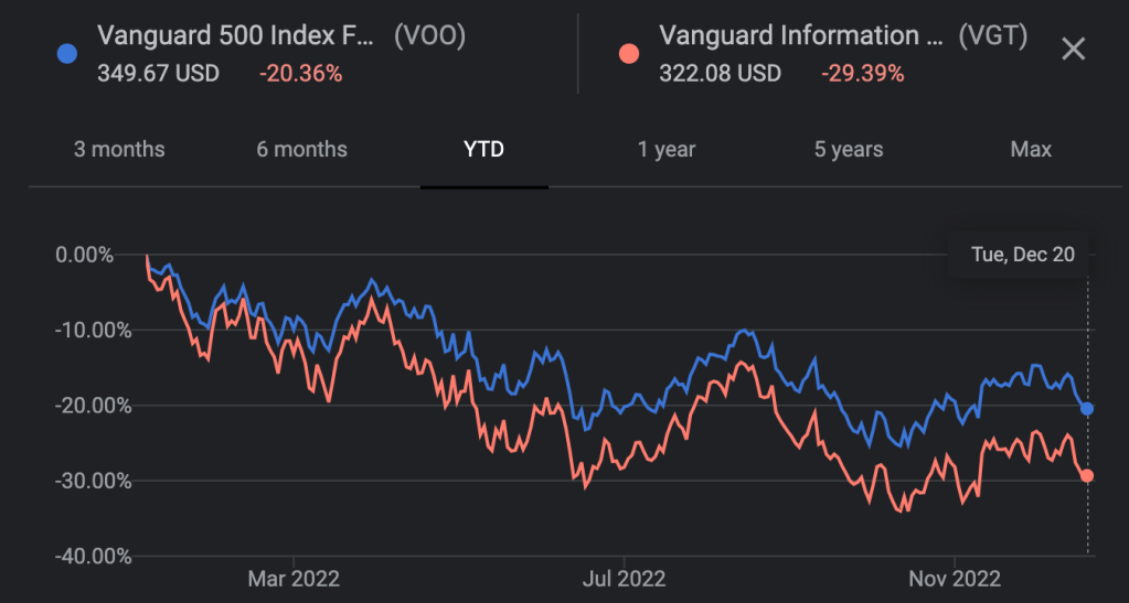 While the S&P 500 is down about 20% for the year, the Technology-focused ETF is down nearly 30% over the same time period. At the time I wrote this, it was a pretty easy prediction, so I’m not going to take too big of a victory lap here. That said, markets can be strange and I think 2022 was worse than most of us imagined at the start of the year. Here’s to hoping 2023 is much better for all sectors.